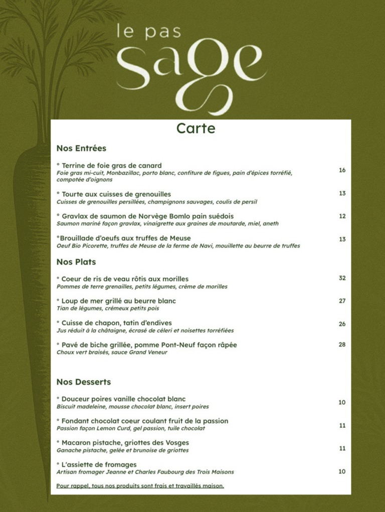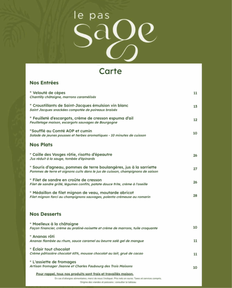 Antoine et Juliette vous proposent une cuisine de type bistro, généreuse et gourmande aux doux accents de cuisine française. Venez explorez notre carte mettant en avant des ingrédients frais et de saison, tous travaillés maison. Nous vous accueillerons dans un cadre chaleureux, confortable et sympathique, pour passer un bon moment en famille, entre amis ou pour votre pause déjeuner. Alors, au plaisir de vous recevoir au Pas Sage !"