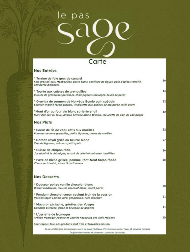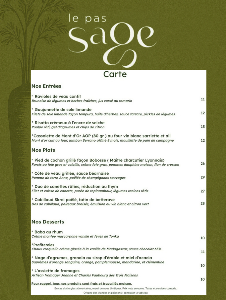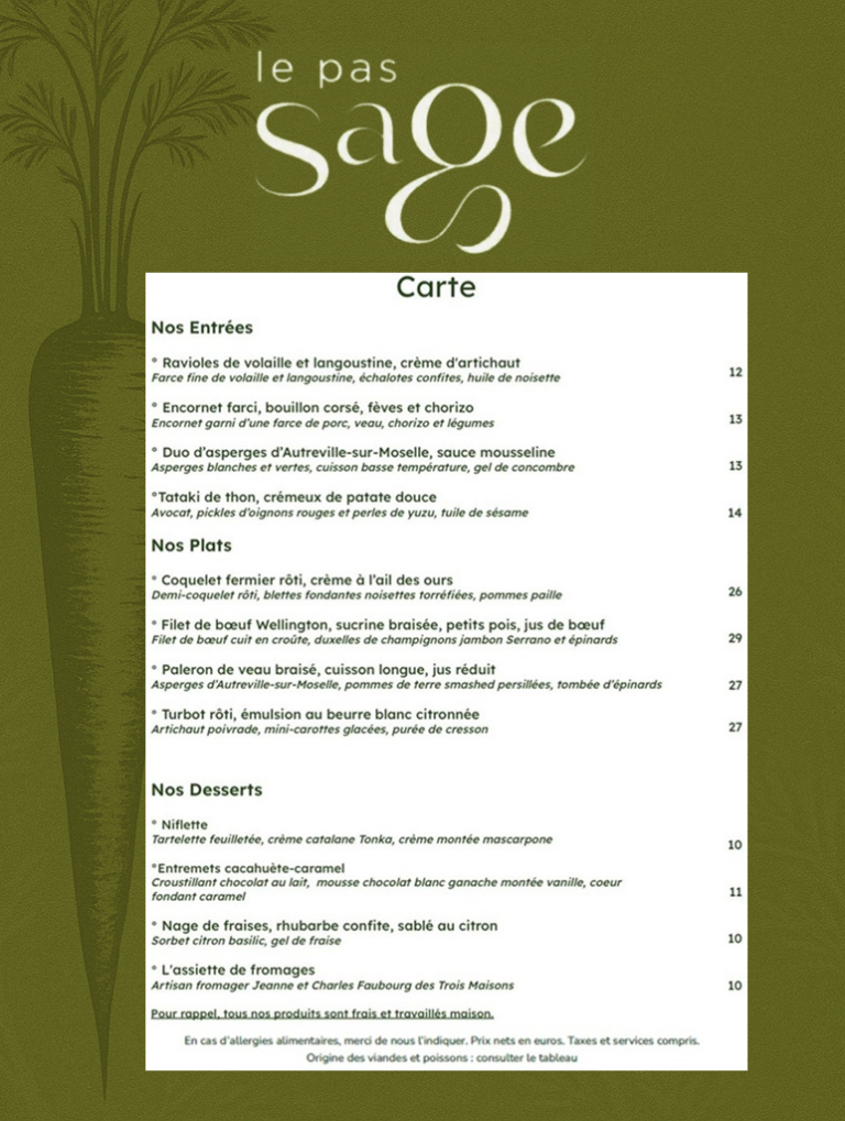Antoine et Juliette vous proposent une cuisine de type bistro, généreuse et gourmande aux doux accents de cuisine française. Venez explorez notre carte mettant en avant des ingrédients frais et de saison, tous travaillés maison. Nous vous accueillerons dans un cadre chaleureux, confortable et sympathique, pour passer un bon moment en famille, entre amis ou pour votre pause déjeuner. Alors, au plaisir de vous recevoir au Pas Sage !"